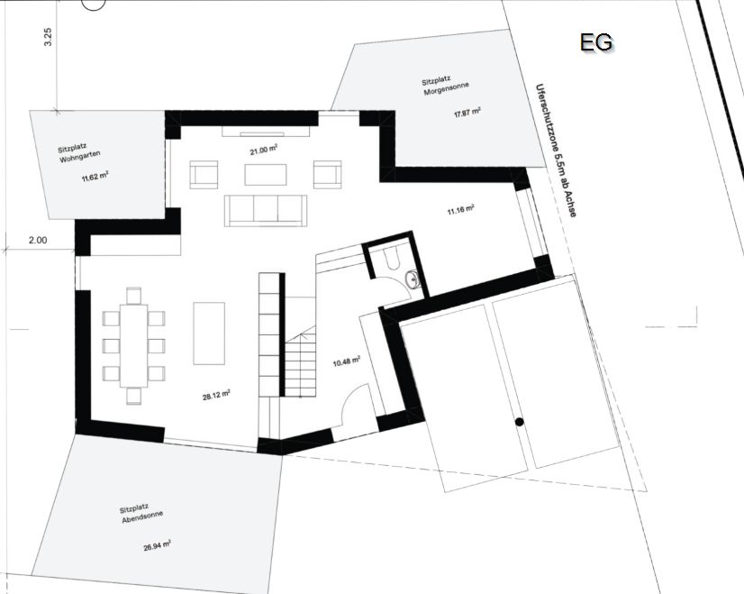 Ebenfalls verabschiedet haben wir uns von dem schönen Satteldach. Aufgrund der Vorgegebenen Grenzabstände und Uferschutzzonen verlaufen die Wände unseres neuen Zuhauses nicht ganz parallel. Dazu kommt die L-Form. All das macht aus einem „gewöhnlichen“ Satteldach ein sehr verwinkeltes Satteldach. Wie immer, ist etwas das nicht der Norm entspricht um einiges teurer. Dieser Bomben-Preis hätte unser Budget gewaltig gesprengt. Also weg damit. Ist etwas gewöhnungsbedürftig, aber hat auch was.