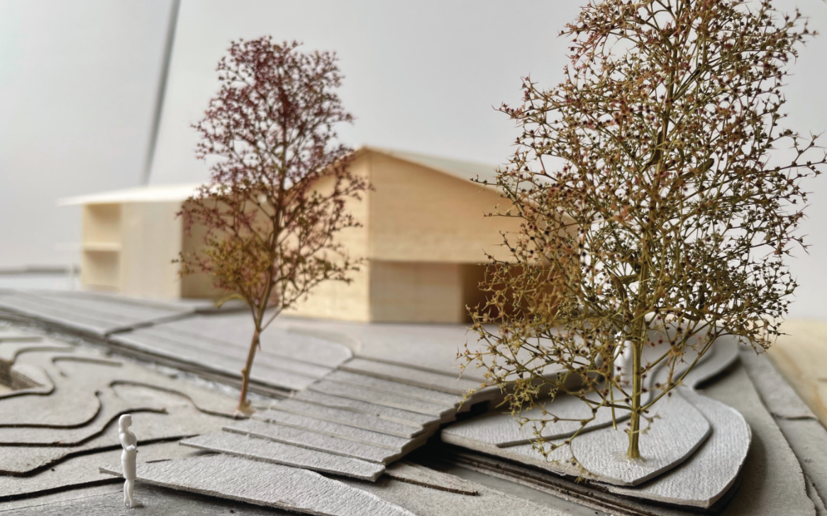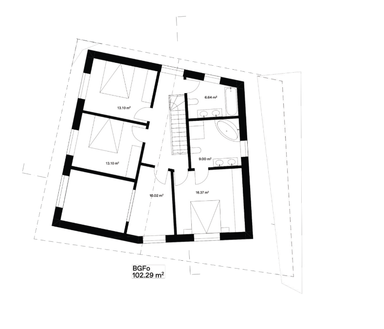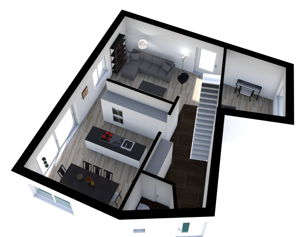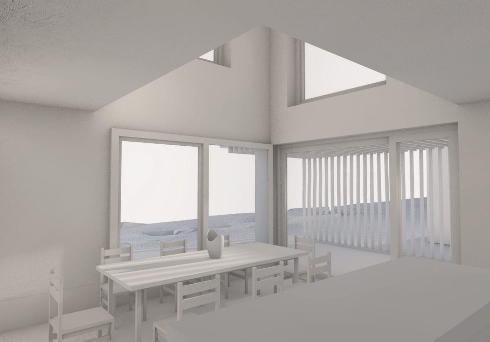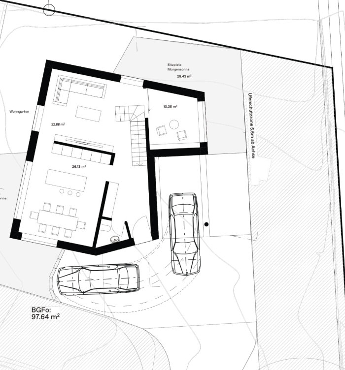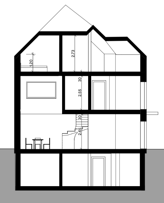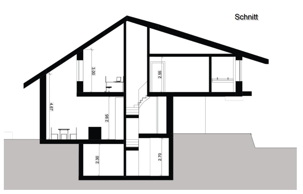 Begrenzt durch einen Bach auf zwei Seiten des Grundstücks, sowie Grenzabständen auf den anderen beiden Seiten, wird die Form des Gebäudes stark vorgegeben. In die Höhe sind wir weniger eingeschränkt. Der Gedanke Platz zu gewinnen indem die Räume auf drei Stockwerke verteilt werden, liegt da nahe. Insbesondere, da wir somit die bereits eingeplante Galerie beim Essbereich beibehalten können.