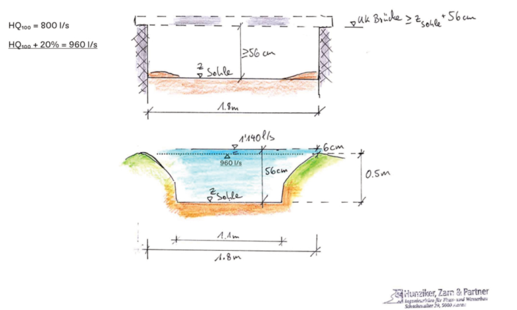 Besonders muss dabei die Möglichkeit eines Jahrhundertwassers berücksichtigt werden. Das heisst man muss damit rechnen, dass der Bach bis auf Ufer höhe ansteigt und ganze Bäume mit transportiert. Auch dann muss das Wasser fliessen können, also hat die Brücke um einiges höher zu sein als das Ufer. Zu lang darf sie dann aber nicht sein, sonst haben Parkplatz und Wendeplatz keinen Raum mehr zwischen Haus und Brücke. Und zu steil auch nicht, sonst bocken sich die Autos auf der Spitze auf. Nichts desto trotz, unsere Architekten haben den Mittelweg gefunden und die Brücke wurde genehmigt.