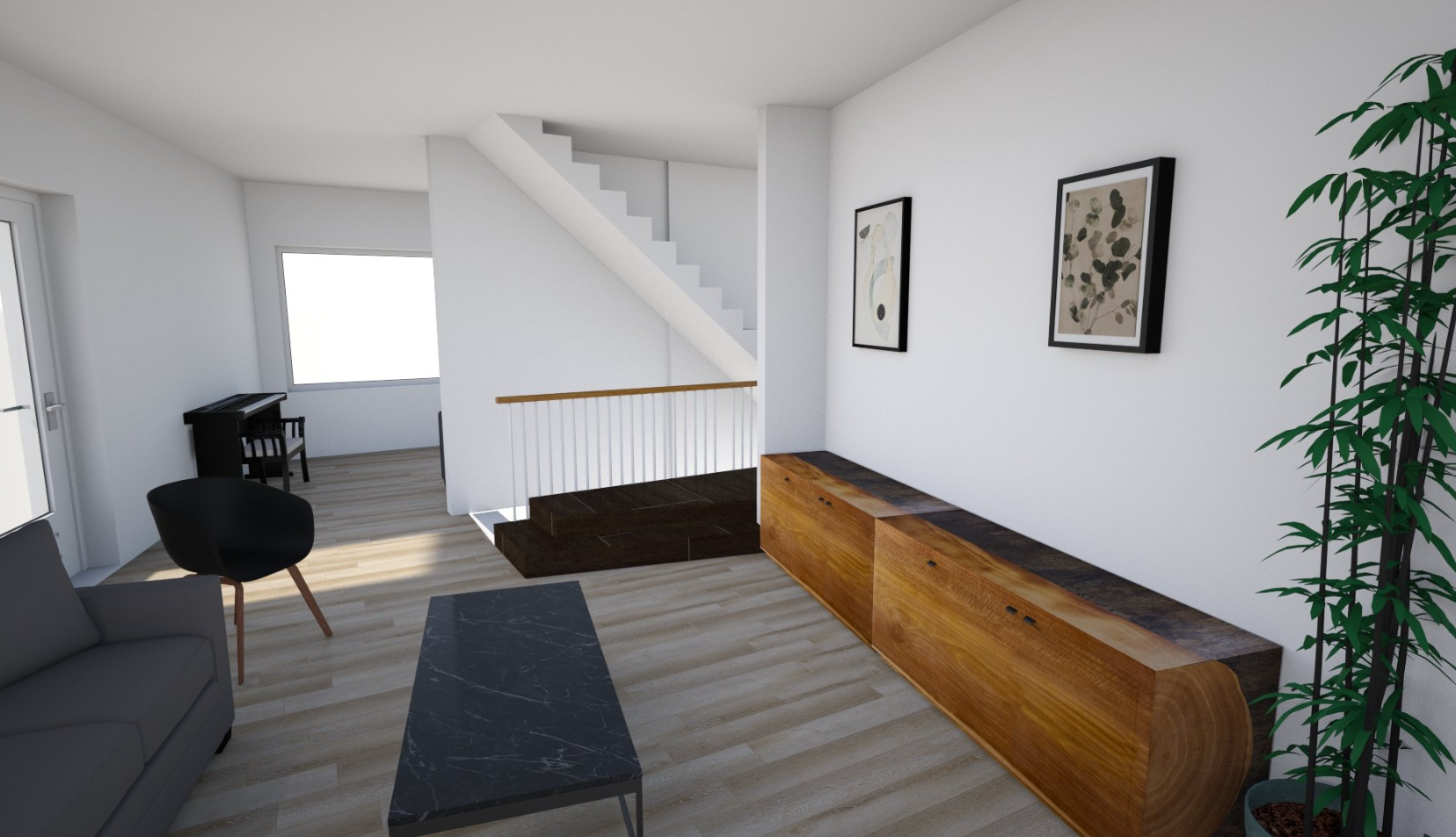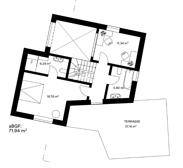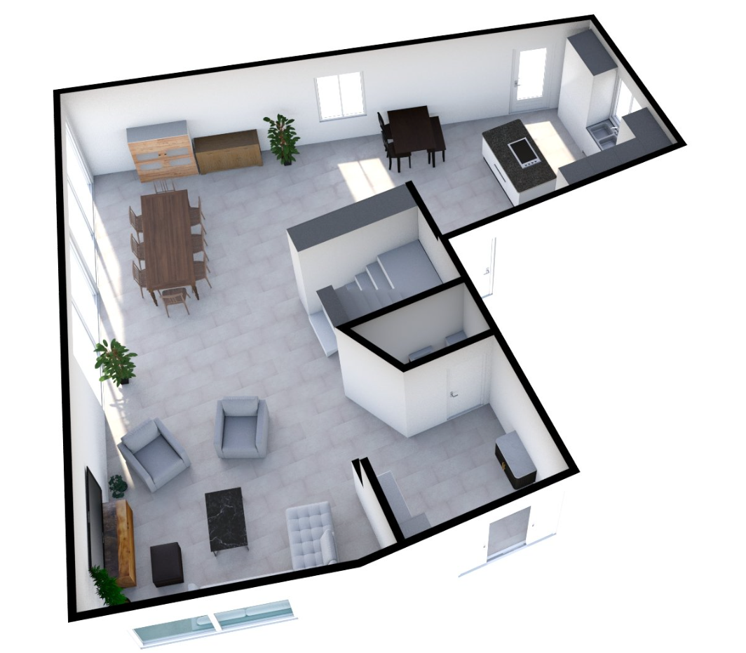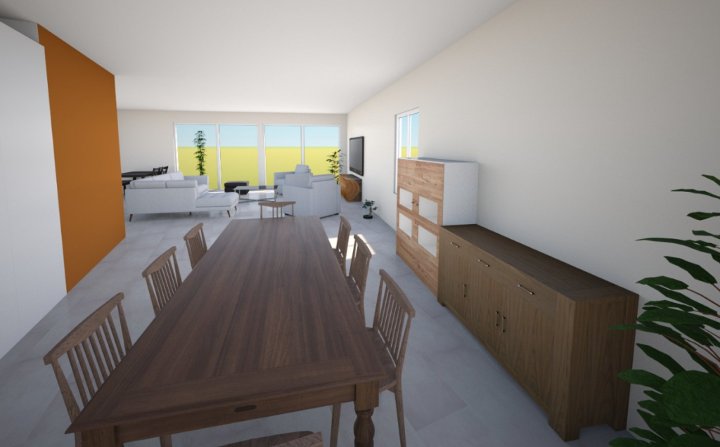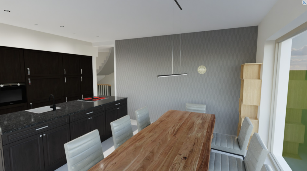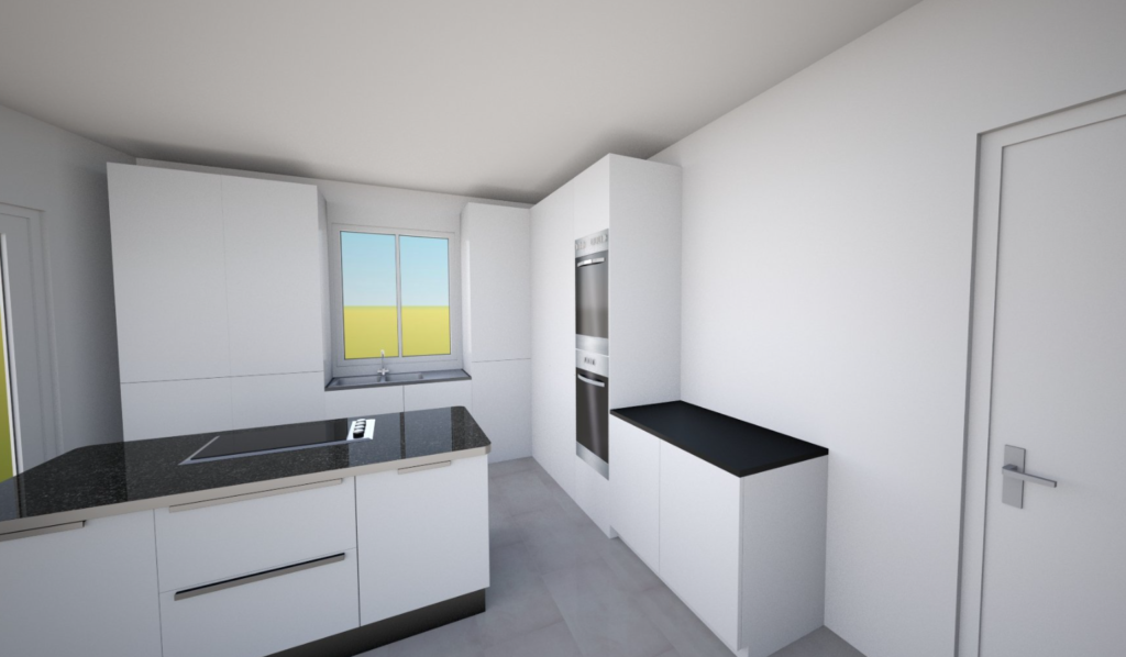 Eine weitere grosse Veränderung ist die Drehung der Küche. Mit den vorherigen Plänen war das OG offener, dafür war das Wohnzimmer gleichzeitig ein Korridor. Es gab zu viele Stellen an denen keine Möbel deponiert werden durften, weil sie sonst im Weg stehen. Durch die Drehung der Küche entsteht eine Trennung der Räume die den Fussweg automatisch am Wohnbereich vorbei leiten und somit eine gemütliche Nische bilden. Auch ist die Küche vom Eingang her besser zugänglich.