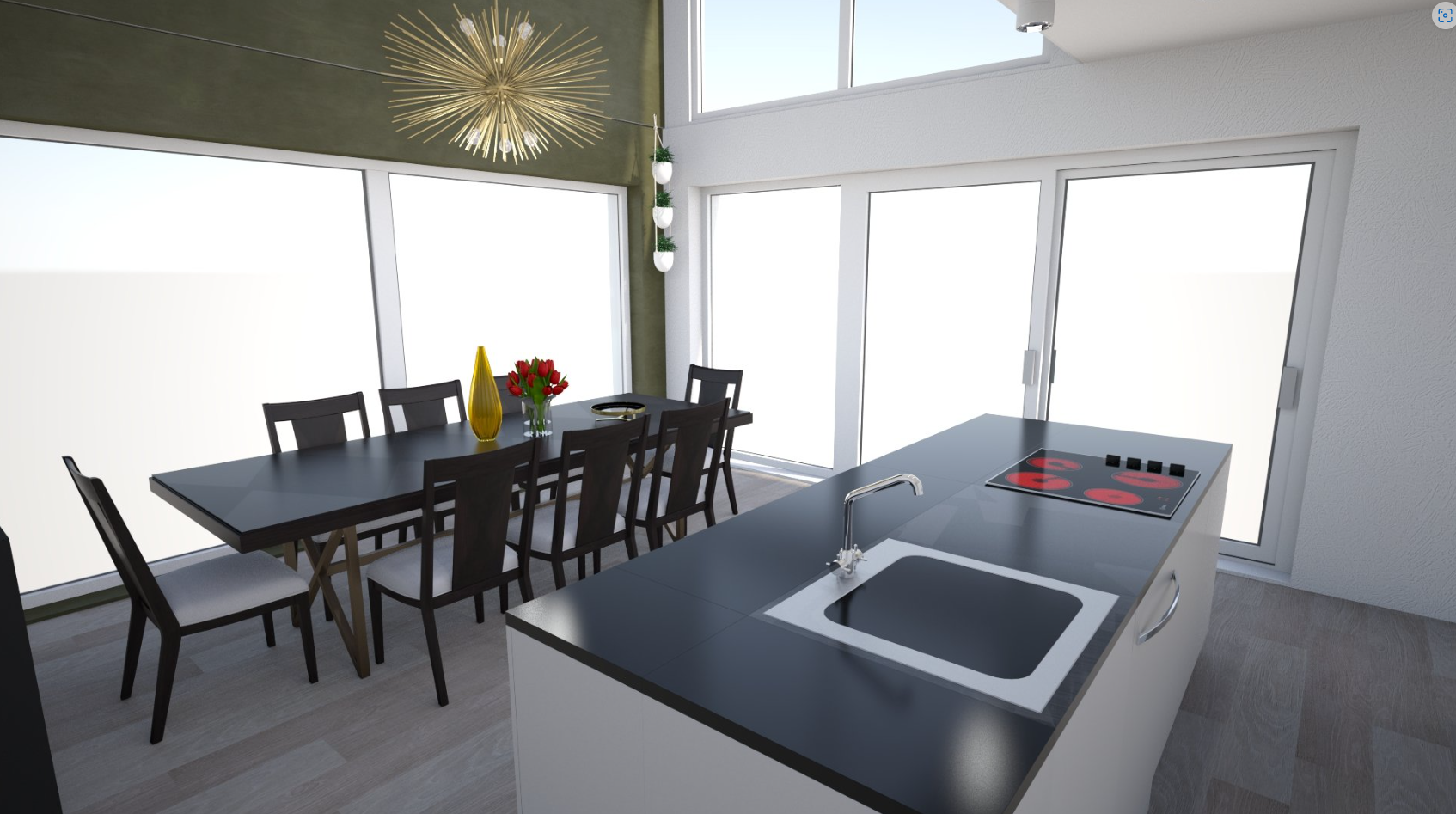 Die drei Stockwerke haben sich nicht bewährt. Es ist einfach zu unpraktisch und die Räume im obersten Stock hätten zu viel Schrägdach. Also zurück zu zwei Etagen. Aber die Raumaufteilung muss optimiert werden. Will man an einem Sommer Abend in der Sonne sitzen, stellt man den Stuhl auf die Südseite des Hauses. Demnach wäre es sinnvoll, nebst der Terrasse auch die Küche und den Essbereich auf dieser Seite zu planen. Das Wohnzimmer gehört ebenfalls in die Nähe der Küche, sonst ist der Transportweg des Popcorns zum Sofa viel zu lang. Auch will man die Einkäufe nicht quer durchs haus tragen bis man beim Kühlschrank ist. Der Eingang muss näher an die Küche. Fazit: Die Küche wird zum Zentrum.