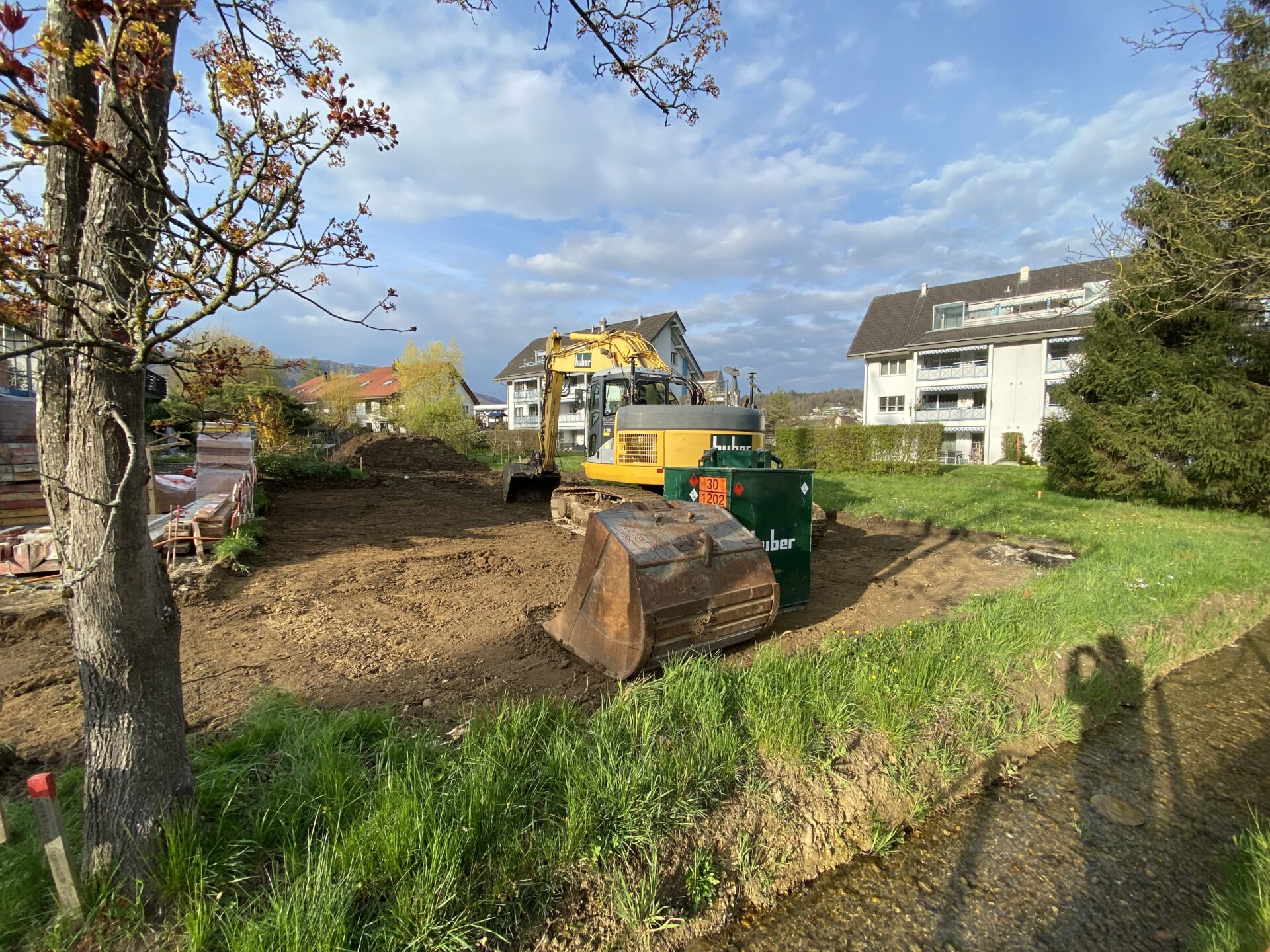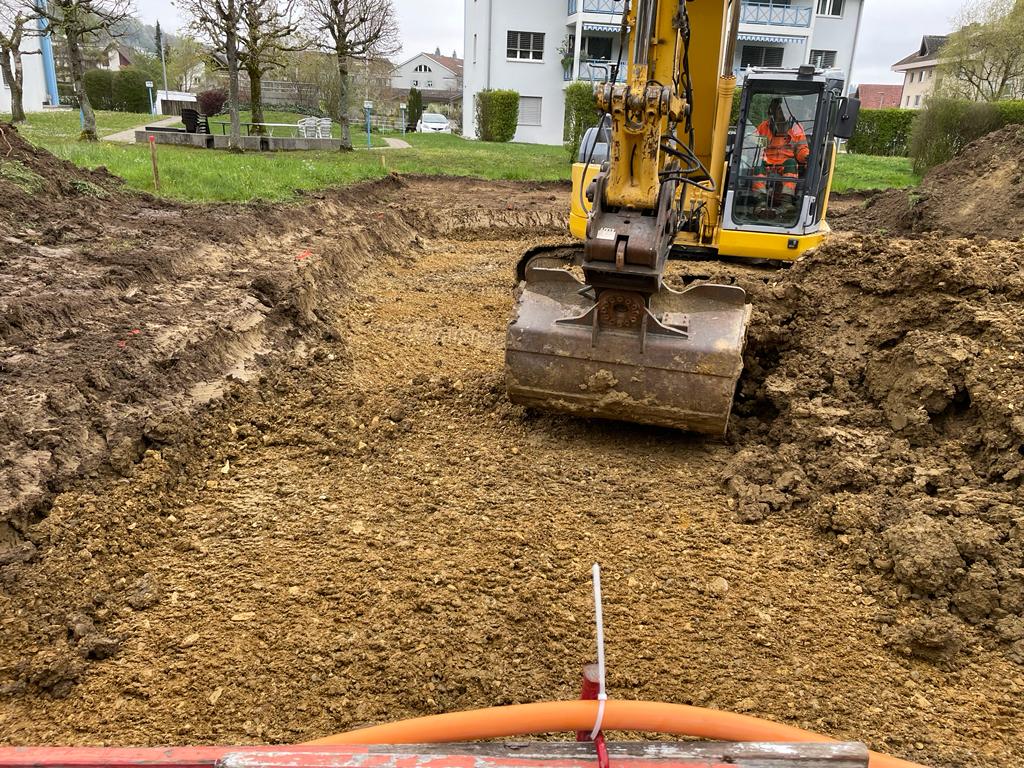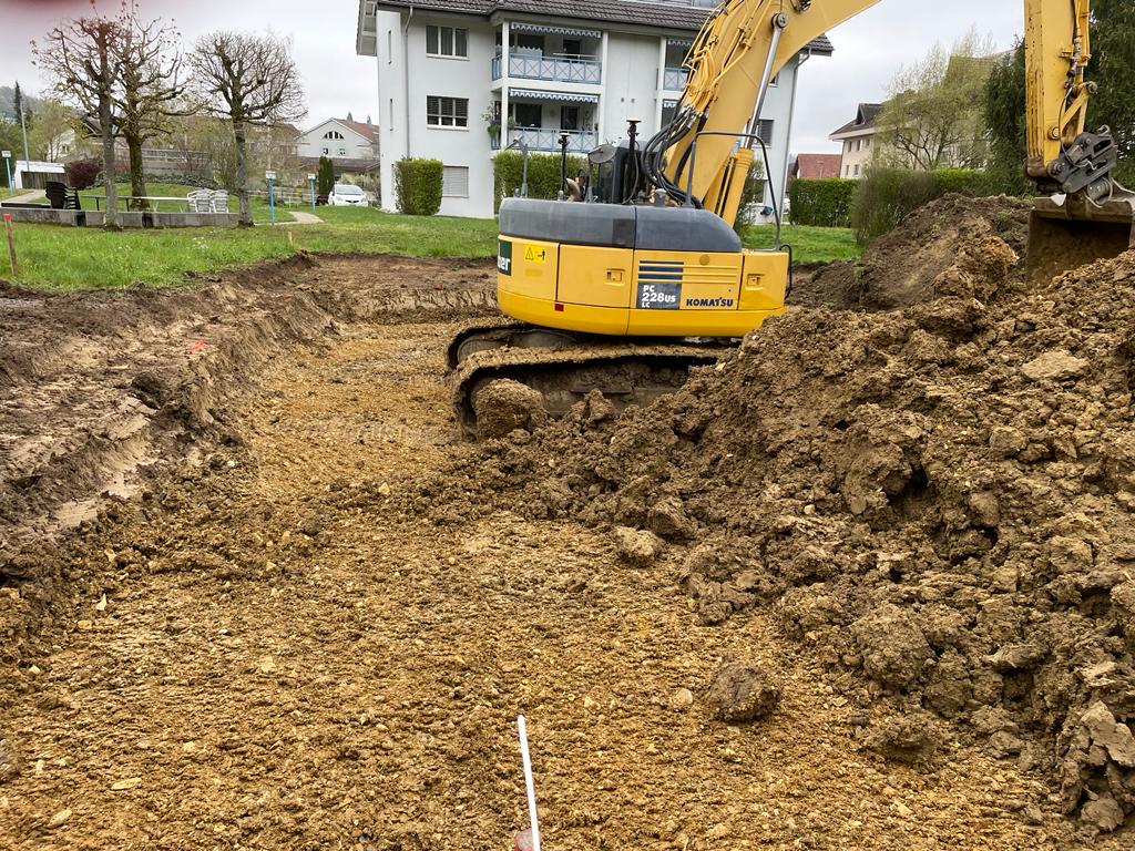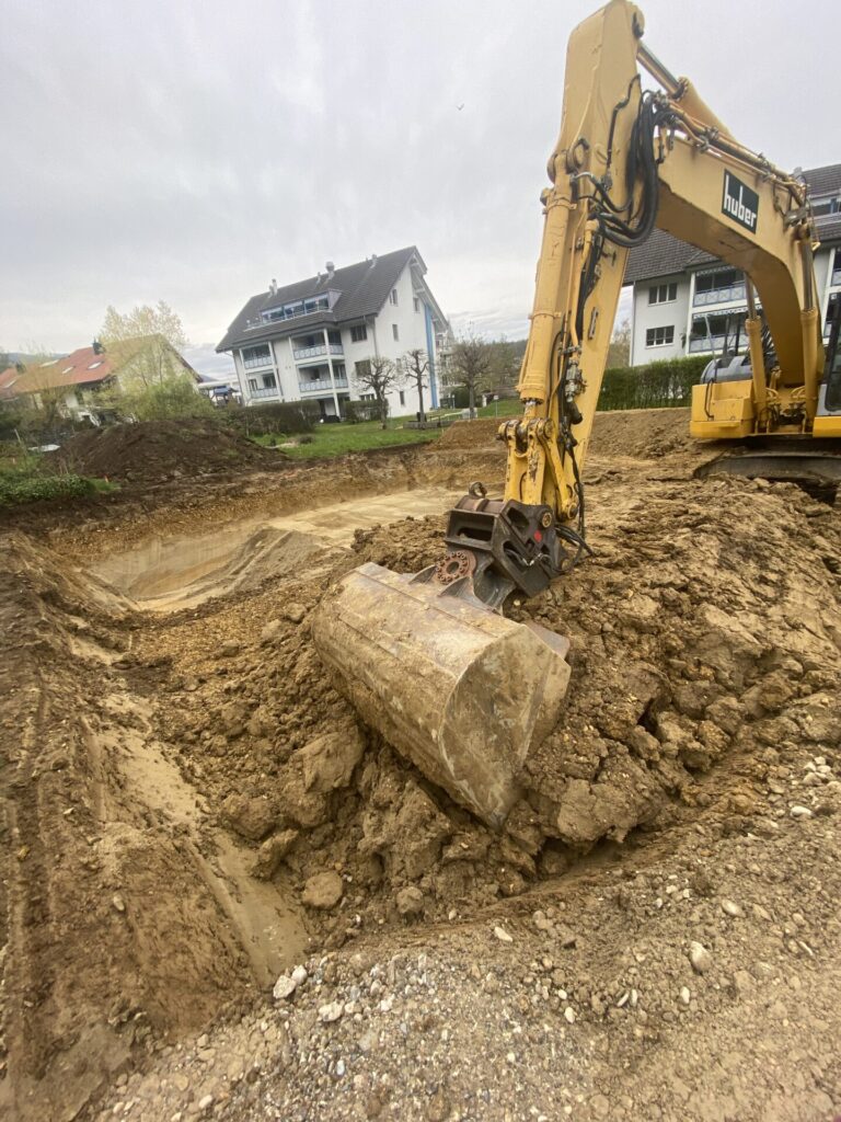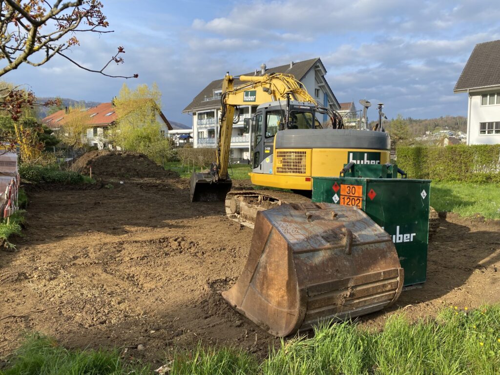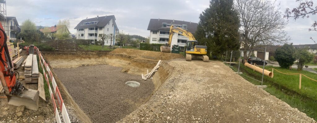 Mit der Baugrube sehen wir die erste richtige VerĂ€nderung auf unserem GrundstĂŒck. Langsam wird klar, dass unser HĂ€uschen nicht mehr nur Theorie ist. Kein Tagtraum welcher plötzlich platzen könnte, sondern tatsĂ€chlich RealitĂ€t. Jeder sichtbare Fortschritt macht Spass und deshalb sind wir regelmĂ€ssig auf der Baustelle und erfreuen uns an der Arbeit anderer Leute.