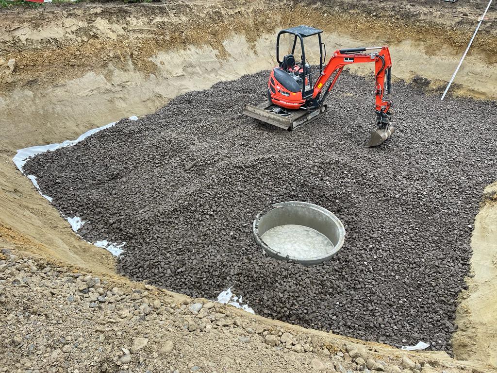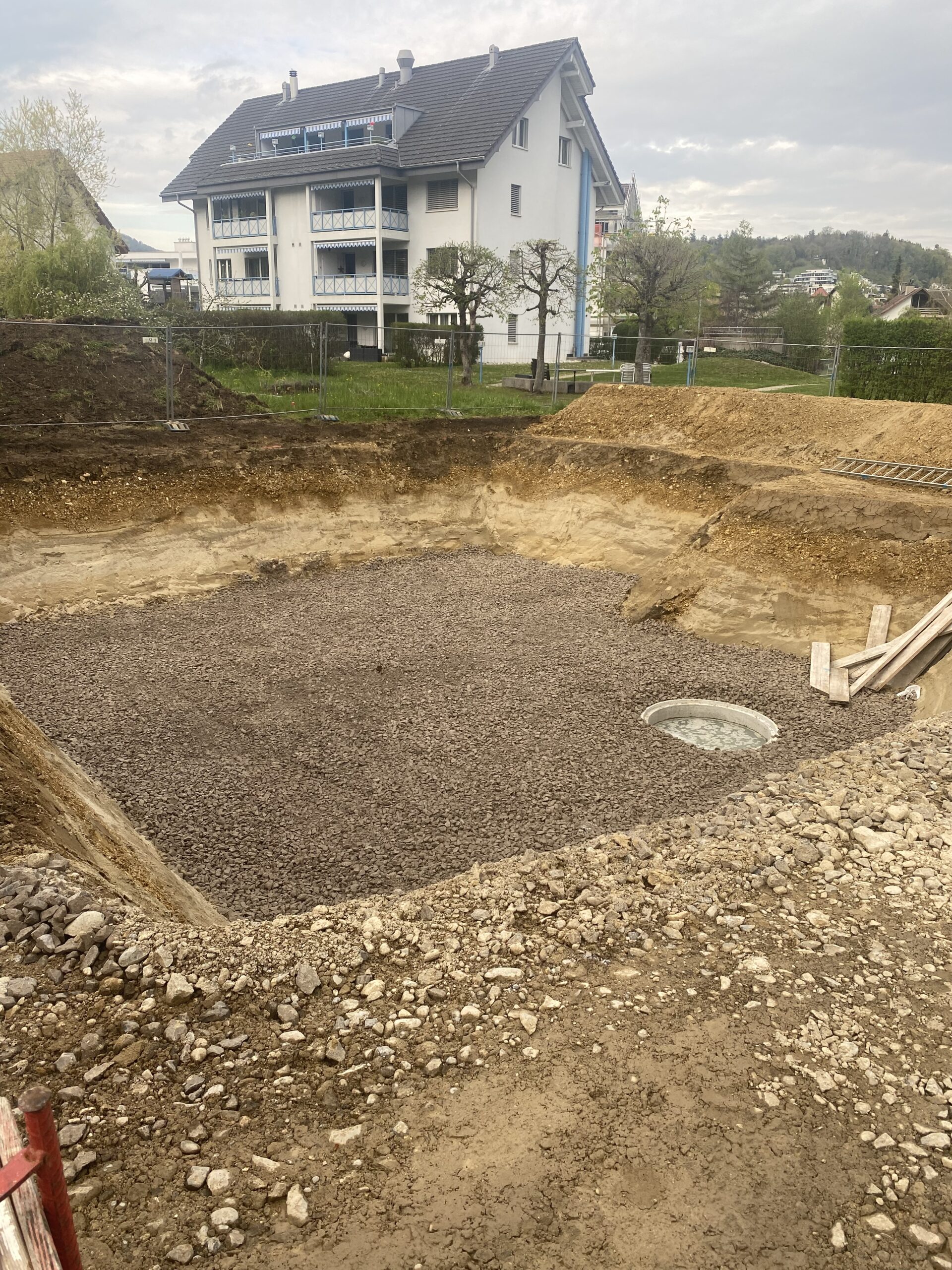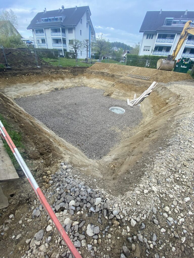 Das launische April Wetter ist einfach Gnadenlos. UnregelmĂ€ssige RegengĂŒsse bremsen die Arbeiten aus. Nichtsdestotrotz, am 26. April ist das Loch soweit gebuddelt und die Bodenverbesserung wird ausgelegt.