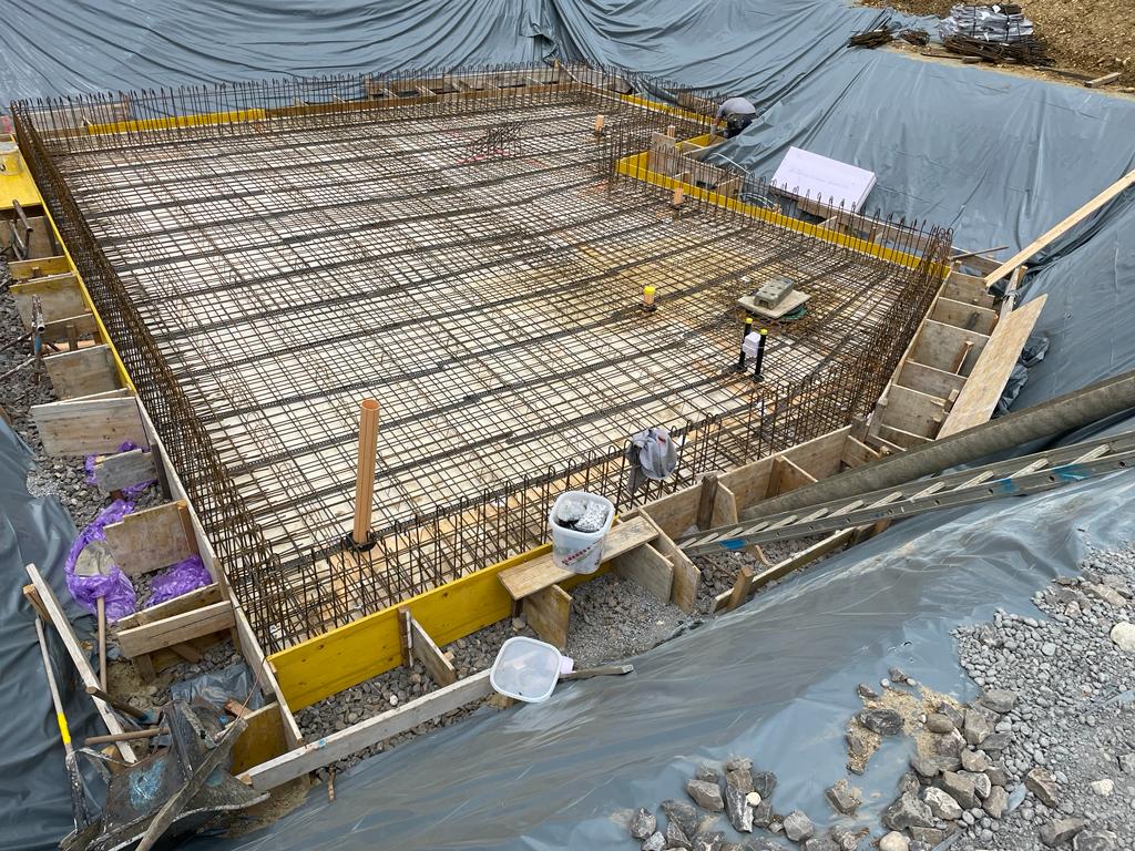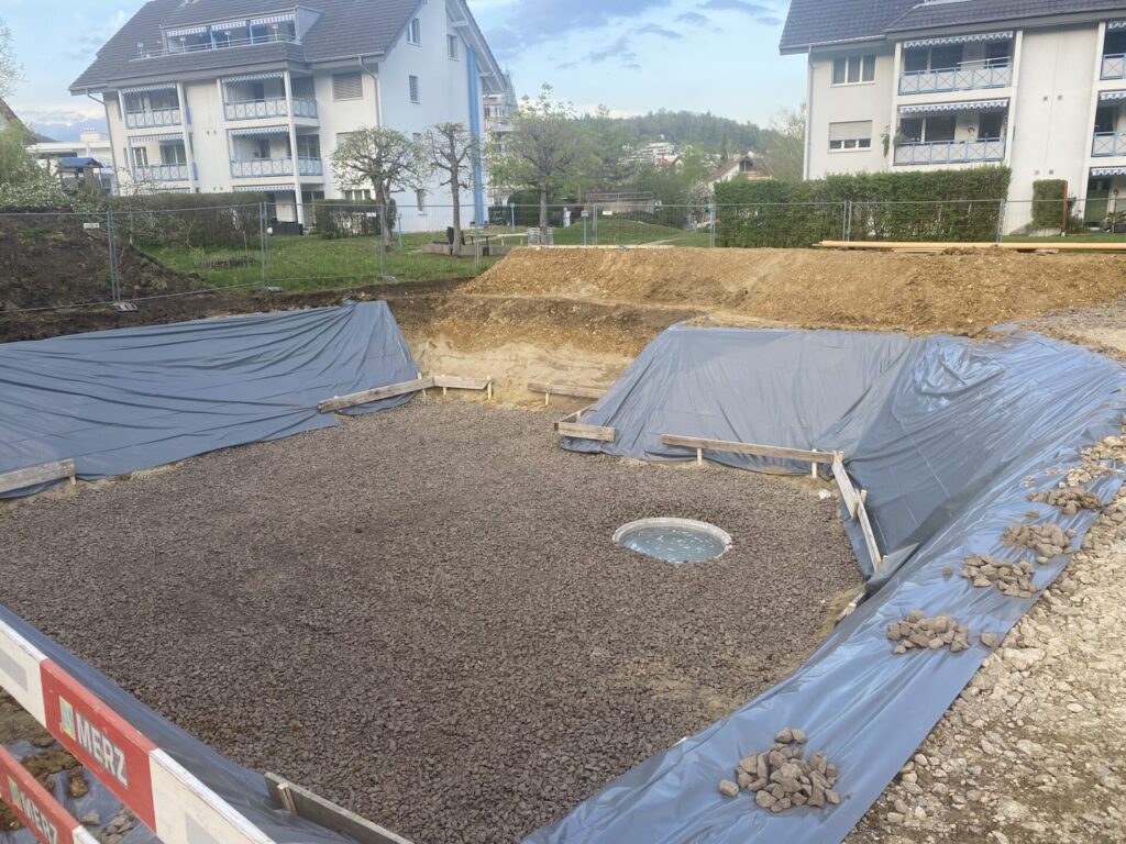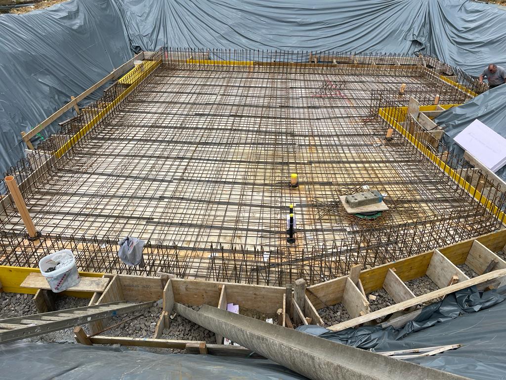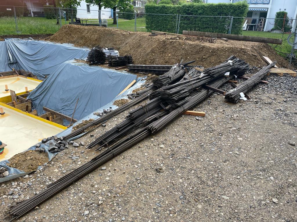 Bereits neben der Baugrube bereitgelegt sind die Armierungseisen welche als nächstes folgen.