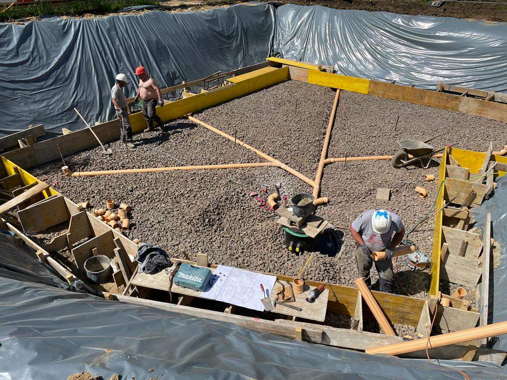 Als nächstes wird der exakte Grundriss abgesteckt sowie die die Abwasserleitungen verlegt.