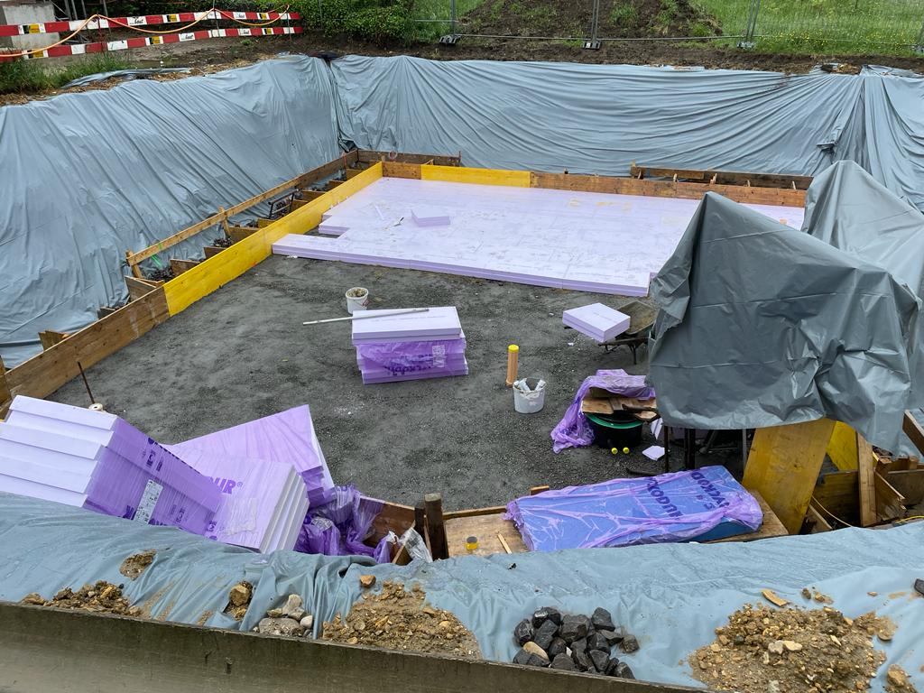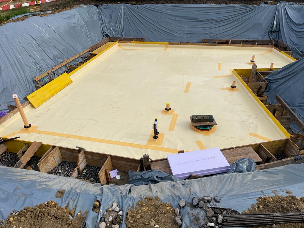 Auf die Isolation folgt eine Folie. Durch einen Chemischen Vorgang verbindet sich die Folie mit dem Beton sobald dieser gegossen wird. Dadurch wird der Boden komplett Wasserdicht.