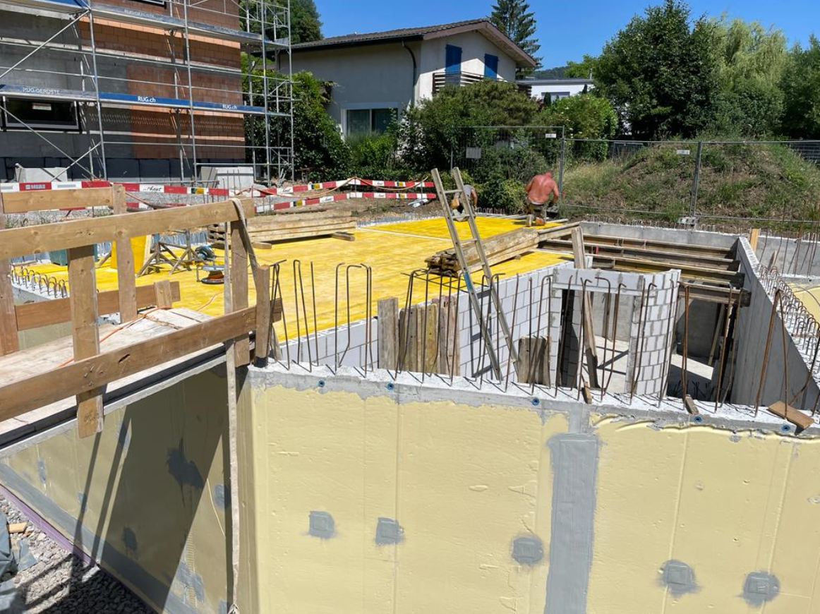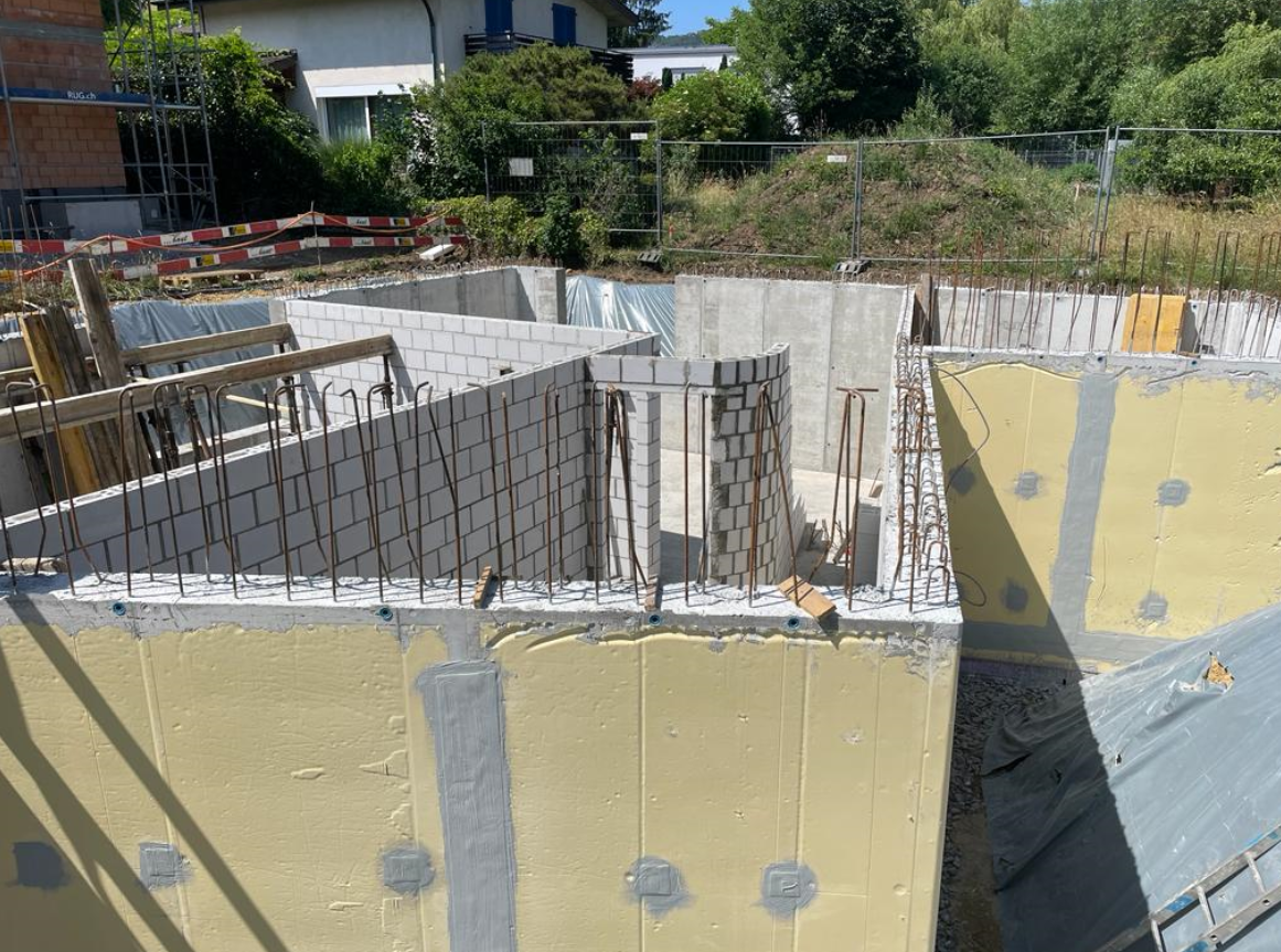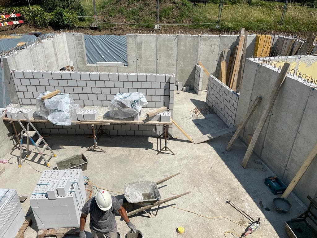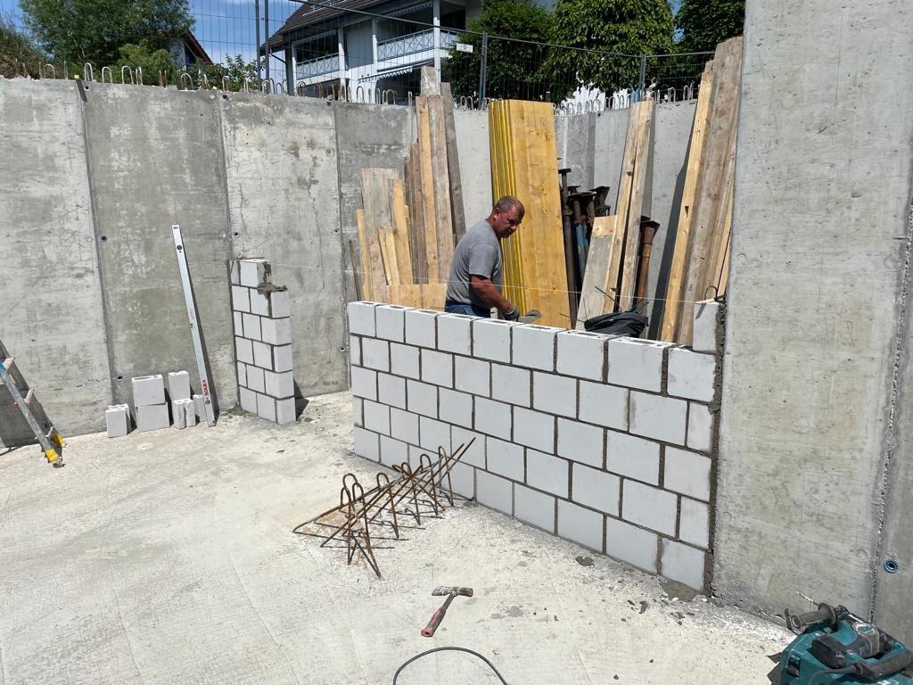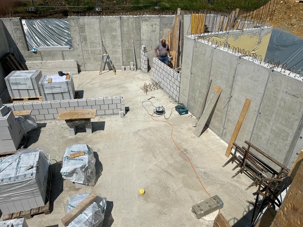 Die Wände werden höher. Mittlerweile sind die einzelnen Räume sehr gut zu erkennen. Ich erkläre euch mal das UG anhand des grössten Bildes in welchem man den Türrahmen mit der gebogenen Wand sieht. Beim unteren Bildrand begonnen: