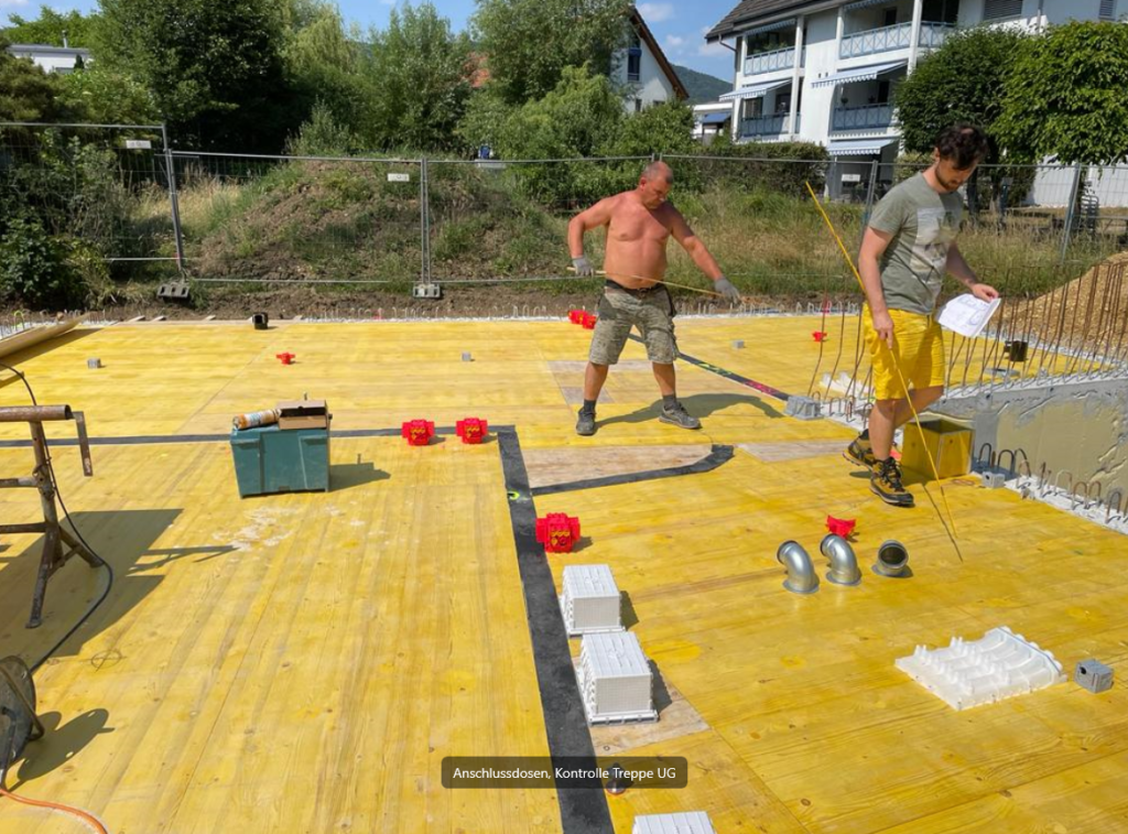 Die Deckenschalung für das UG wird vorbereitet und sämtliche Rohre und Leitungen (Strom, Wasser, Lüftung) werden aufgeschraubt. Bis Ende der nächsten Woche soll nämlich die Decke betoniert werden und dann gilt das UG vorläufig als abgeschlossen (natürlich ohne Verputz etc. aber das ist eine andere Geschichte).